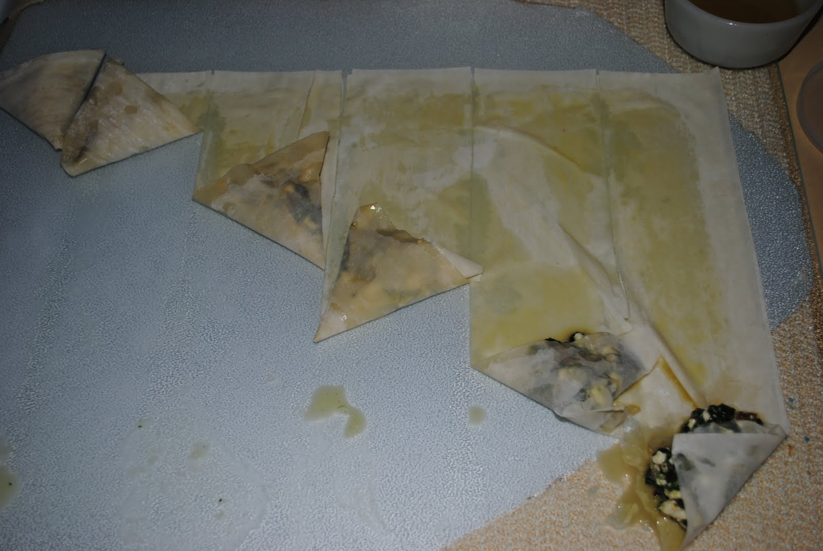 Place the finished triangles onto a pan (preferable to use a pan with sides as sometimes the filling escapes when the spanakopitas are baking).